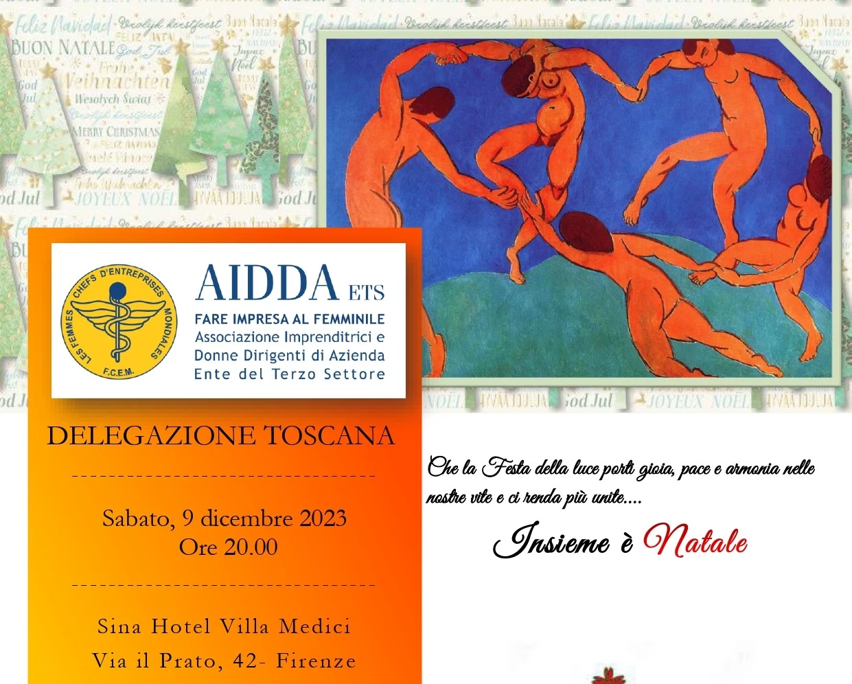 AIDDA Toscana "Insieme è Natale" sabato 9 dicembre 2023 ore 20:00 c/o Sina Hotel Villa Medici, Firenze PDF_Programma Invito_AIDDA Toscana: "Insieme è Natale" sabato 9 dicembre 2023 ore 20:00 c/o Sina Hotel Villa Medici, Firenze Per info e partecipazioni contattare delegazionetoscana@aidda.org Per info e partecipazioni contattare delegazionetoscana@aidda.org