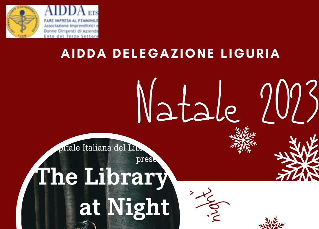 AIDDA Liguria "Natale 2023" mercoledì 13 dicembre 2023 ore 19:30 ore 19:30 Palazzo Lomellino – Mostra "The library at night" ore 20:30 Cena da Cambi Cafè, Via Garibaldi 1R, Genova Per maggiori info e partecipazioni contattare delegazioneliguria@aidda.org Per maggiori info e partecipazioni contattare delegazioneliguria@aidda.org