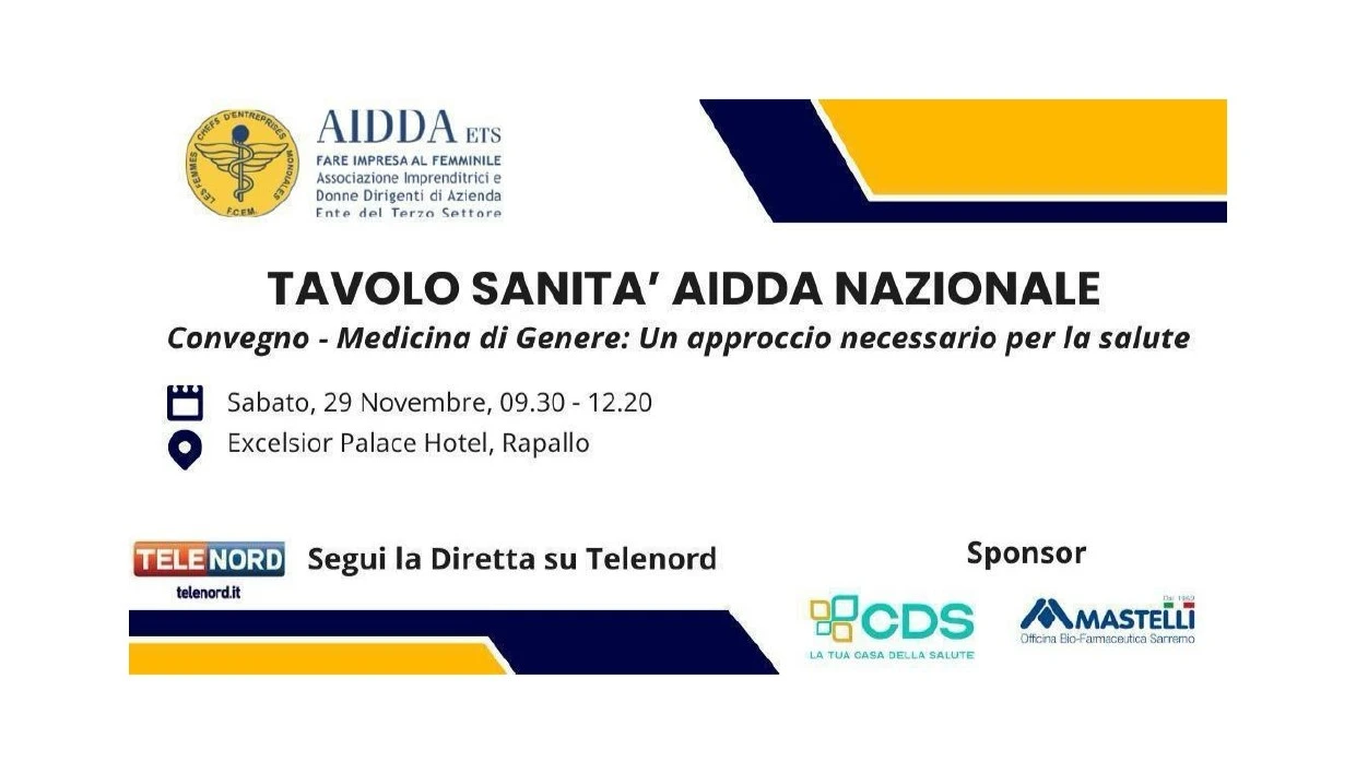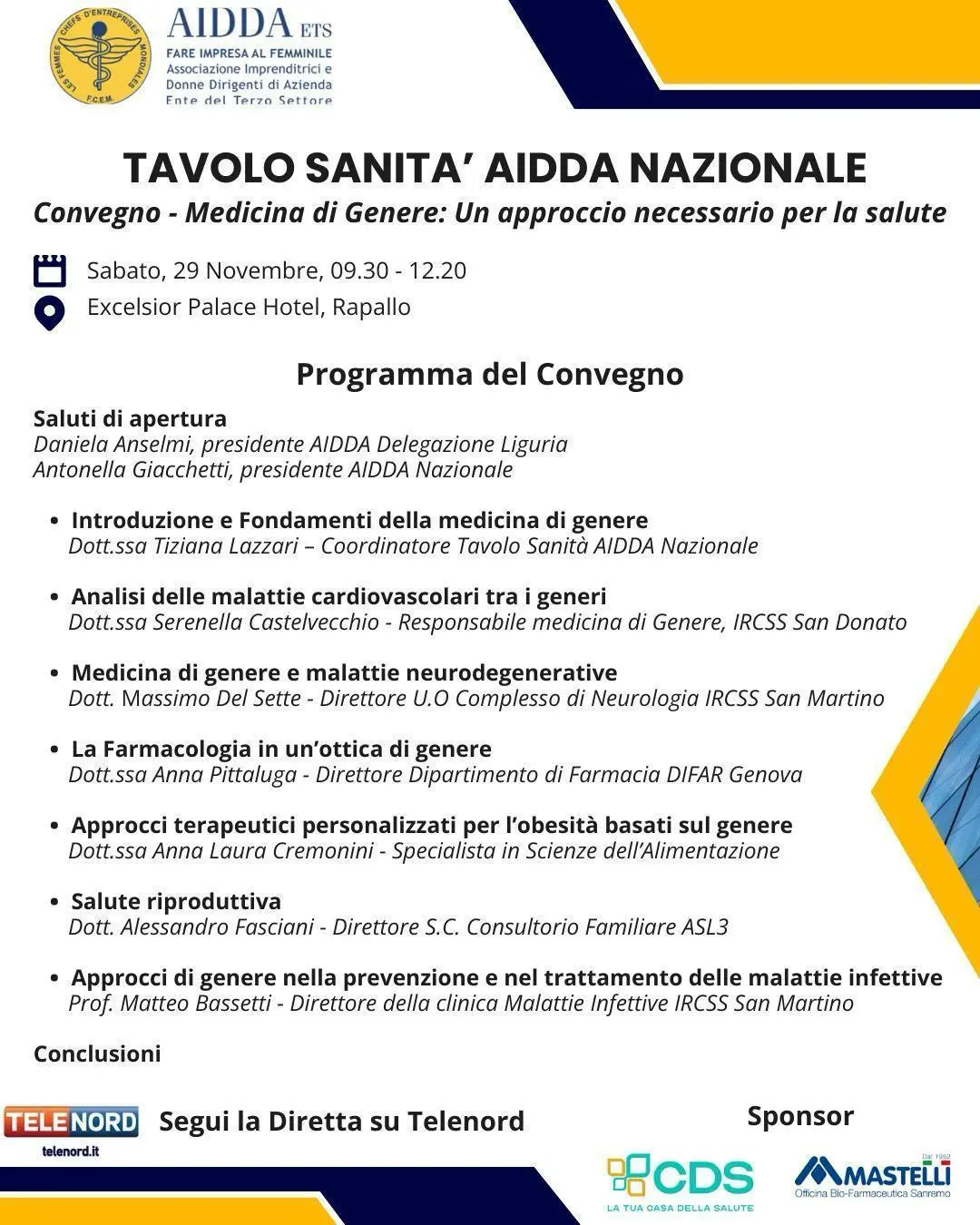 Il giorno seguente, sabato 29 novembre, l’Excelsior Palace Hotel di Rapallo ospiterà il convegno nazionale del Tavolo Sanità Aidda, intitolato “Medicina di genere: un approccio necessario per la salute”, con diretta su Telenord. L’appuntamento metterà a confronto esperte e specialisti di rilievo nazionale per analizzare le differenze biologiche e socio-culturali tra uomini e donne e il loro impatto su prevenzione, diagnosi e terapie.