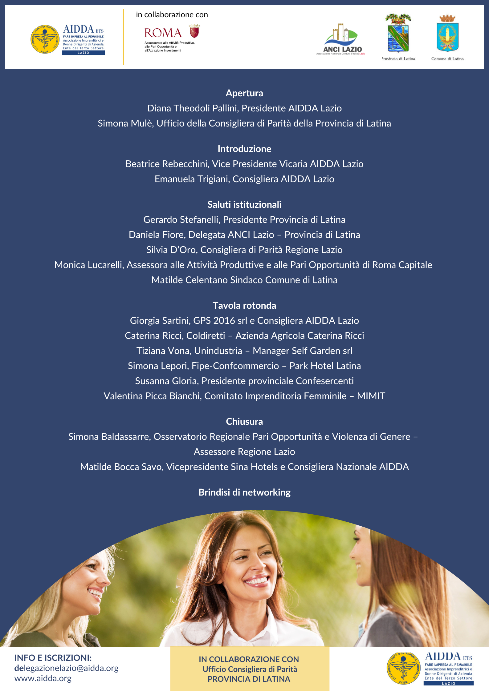 In collaborazione con: Ufficio della Consigliera di Parità della Provincia di Latina e Assessorato alle Attività Produttive, Pari Opportunità e Attrazione Investimenti di Roma Capitale.
