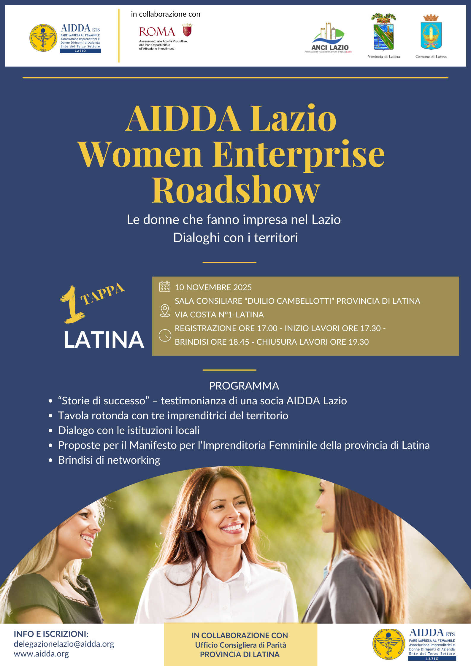 Siamo felici di invitarvi alla prima tappa del progetto “AIDDA Lazio Women Enterprise – Roadshow”, che si terrà a Latina il 10 novembre 2026, presso la Sala Consiliare “Duilio Cambellotti” della Provincia di Latina, con inizio dei lavori alle ore 17.30.