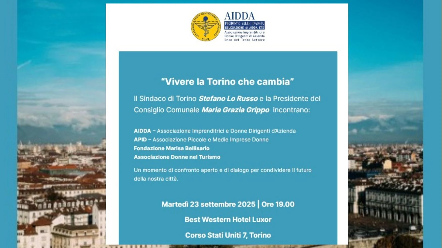 La Delegazione Piemonte Valle d’Aosta invita all’incontro “Vivere la Torino che cambia – Un momento di confronto aperto e di dialogo per condividere il futuro della nostra città” di martedì 23 settembre 2025 alle ore 19.00 presso il Best Western Hotel Luxor, Corso Stati Uniti 7, Torino.