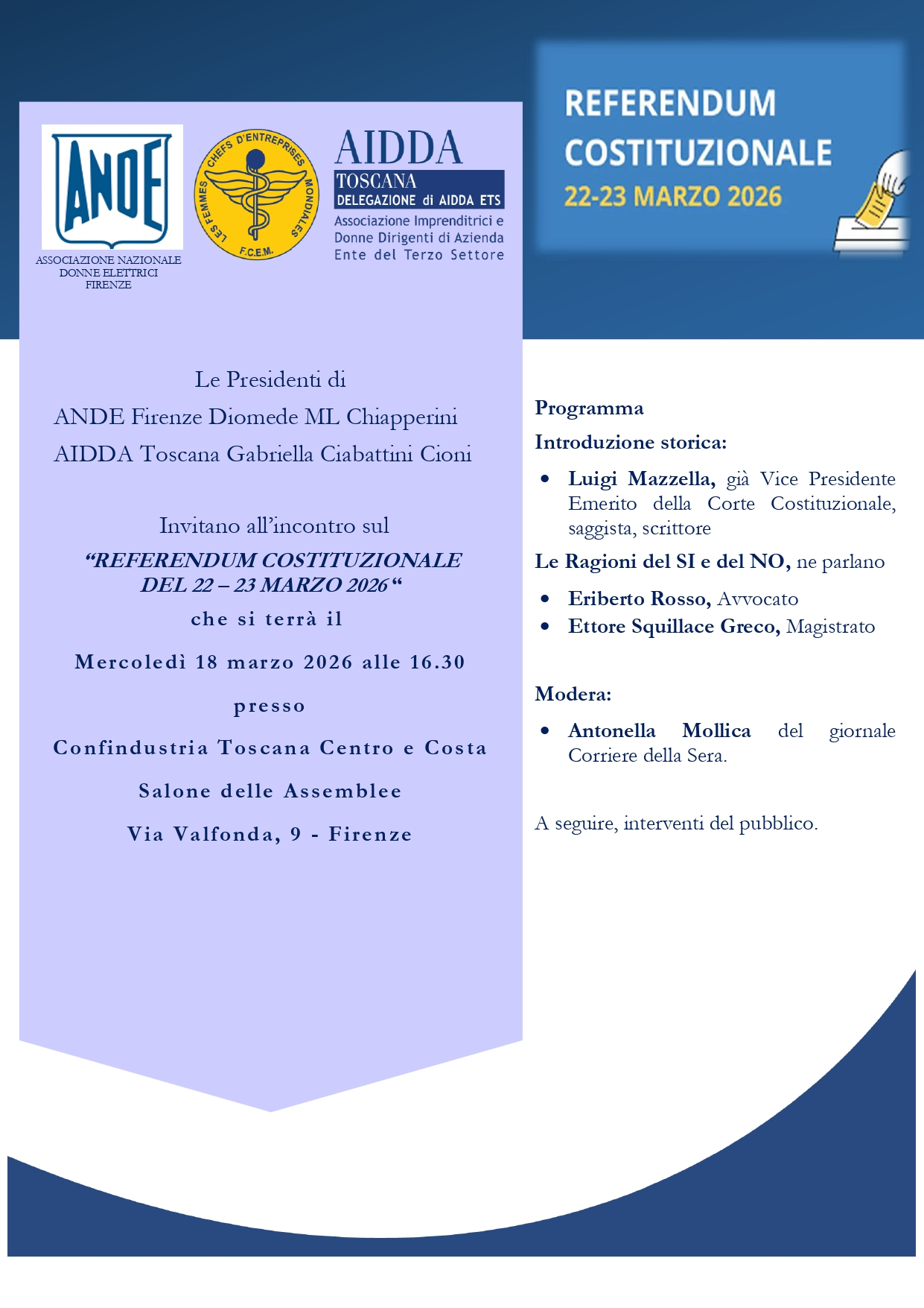 Invitano all’incontro sul “REFERENDUM COSTITUZIONALE DEL 22 – 23 MARZO 2026“ che si svolgerà presso Confindustria Toscana Centro e Costa il 18 marzo 2026 ore 16:30