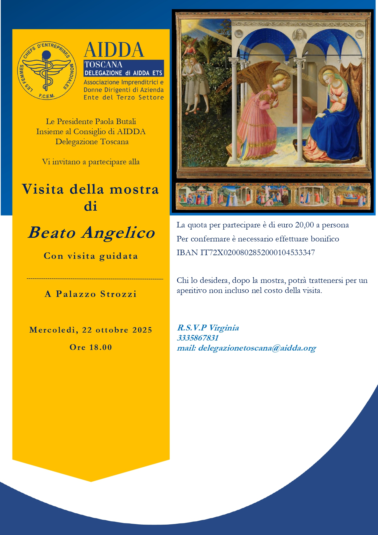 Le Presidente Paola Butali insieme al Consiglio di AIDDA Delegazione Toscana vi invitano a partecipare alla visita della mostra di Beato Angelico con visita guidata a Palazzo Strozzi, mercoledì, 22 ottobre 2025 alle ore 18:00.