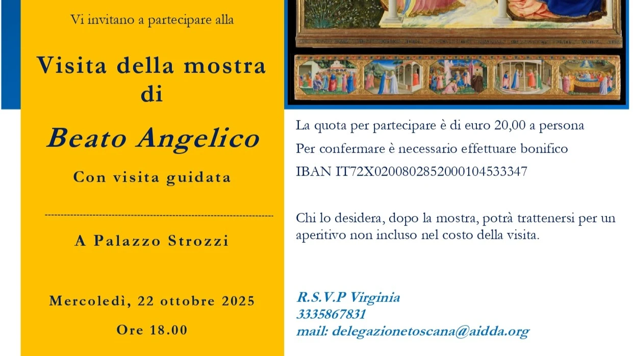 Le Presidente Paola Butali insieme al Consiglio di AIDDA Delegazione Toscana vi invitano a partecipare alla visita della mostra di Beato Angelico con visita guidata a Palazzo Strozzi, mercoledì, 22 ottobre 2025 alle ore 18:00.