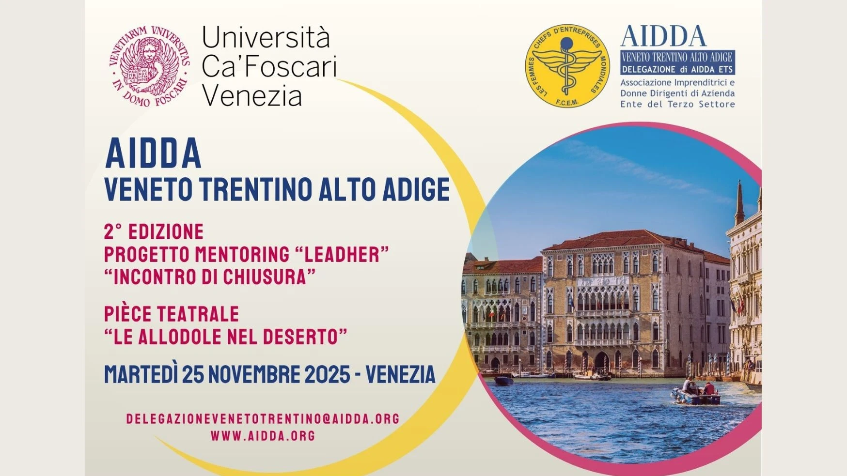 il 25 novembre 2025 si concluderà la 2° edizione del Progetto Mentoring “LeadHer” – AIDDA Delegazione Veneto Trentino Alto Adige & Università Ca’ Foscari Venezia – che ha visto varie Associate e Sostenitrici della nostra Delegazione diventare mentor e accompagnare alcune studentesse mentee di area magistrale di Ca’ Foscari in un percorso di orientamento alla professione, arricchito dal confronto diretto con chi vive ogni giorno la sfida di gestire un’impresa.Ringraziamo tutte loro per la loro disponibilità e la nostra Sostenitrice Arianna Cattarin, Responsabile del Progetto LEI – Leadership, Energia, Imprenditorialità – che promuove questo percorso.