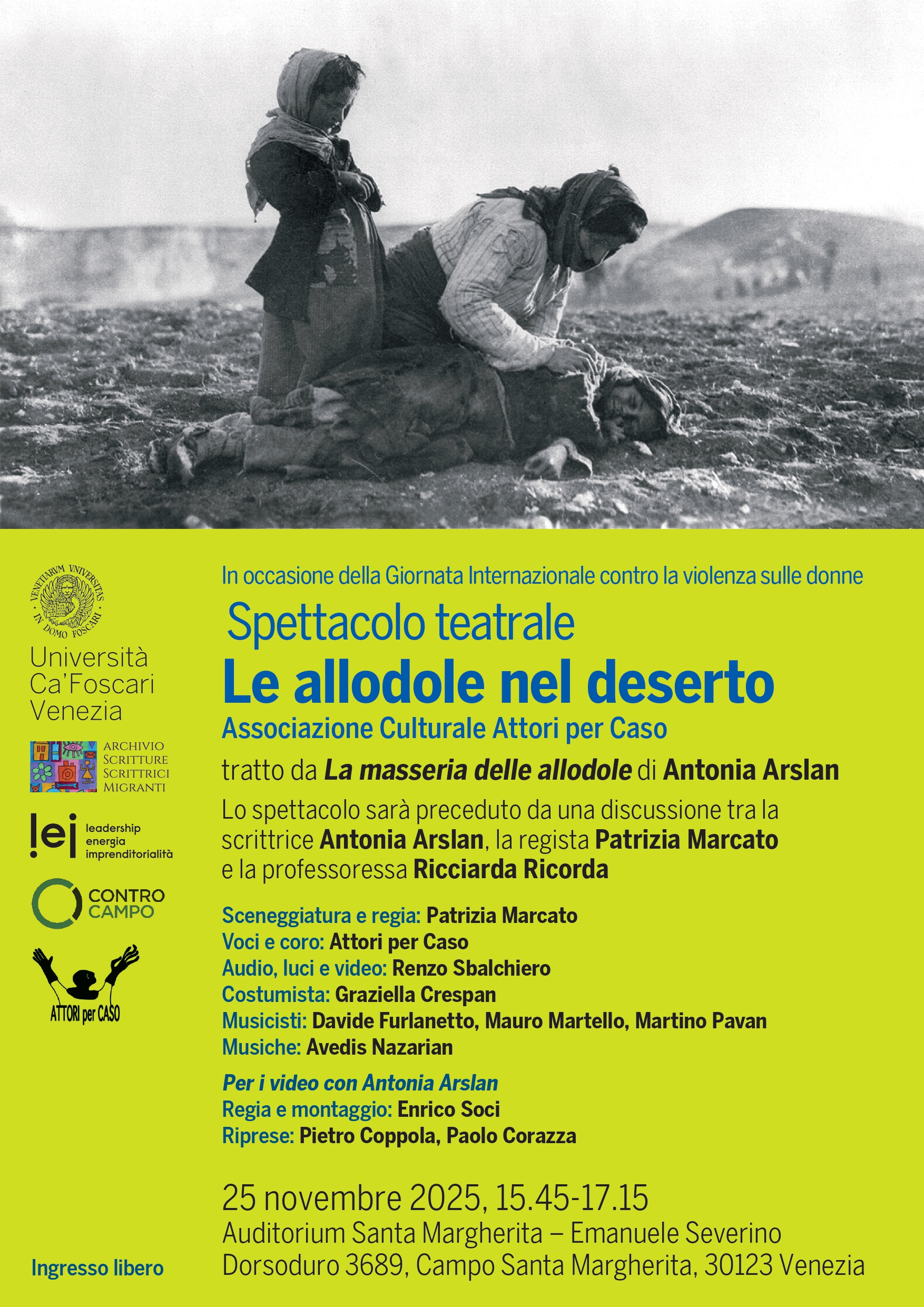 L’Università Ca’ Foscari Venezia, in collaborazione con il Progetto LEI, ha il piacere di invitarvi il giorno 25 Novembre,Giornata internazionale contro la violenza sulle donne, alle ore 15.45 presso l’Auditorium Santa Margherita – Emanuele Severino, per assistere allo pièce teatrale Le allodole nel deserto, tratto da La masseria delle allodole di Antonia Arslan. Un intenso spettacolo dedicato al ruolo resiliente delle donne durante il periodo drammatico del genocidio degli Armeni.