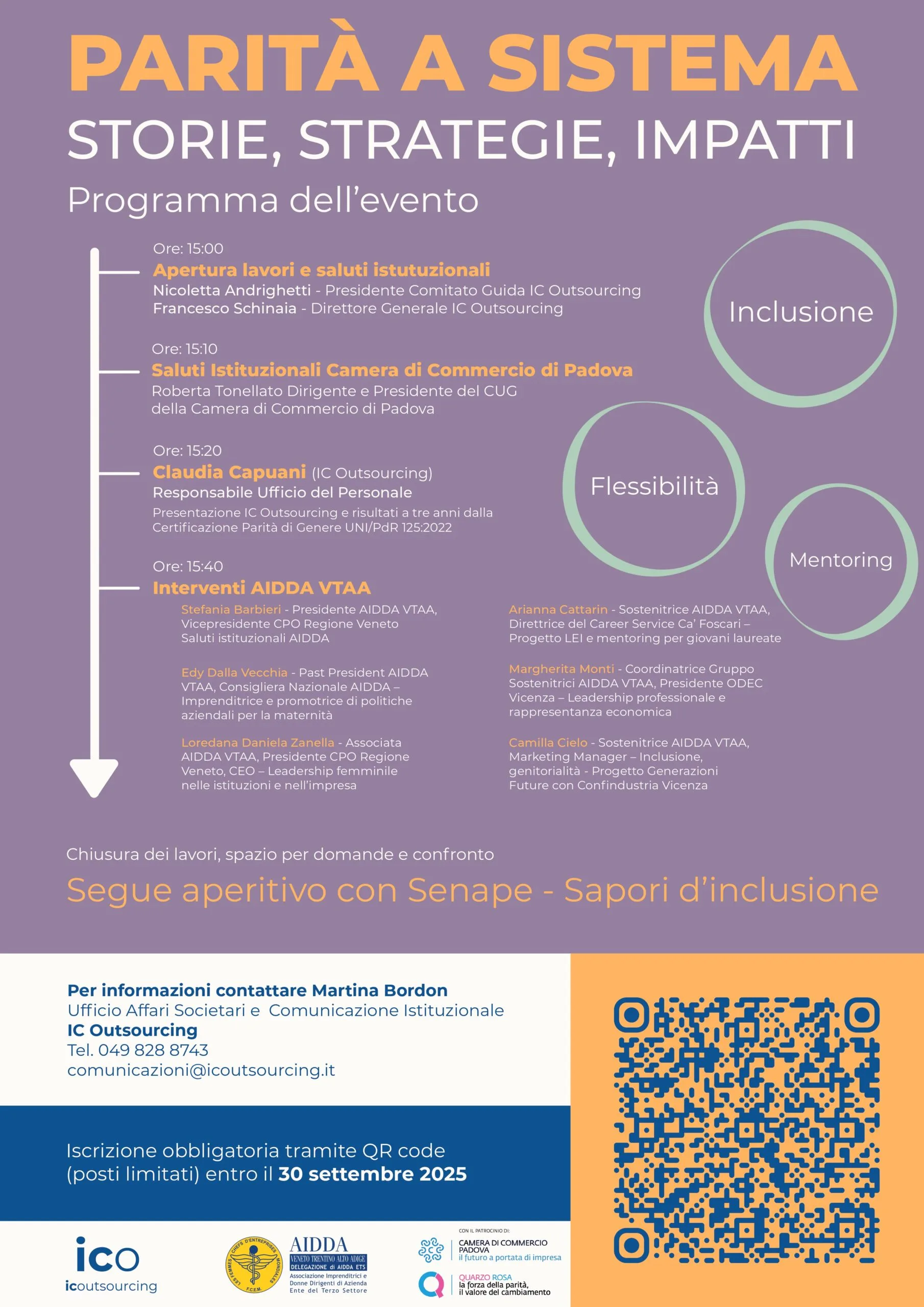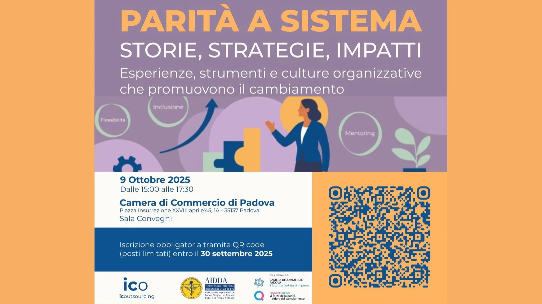 Convegno “PARITA’ A SISTEMA – STORIE, STRATEGIE, IMPATTI. Esperienze, strumenti e culture organizzative che promuovono il cambiamento”organizzato da IC Outsourcing in collaborazione con la nostra Delegazione AIDDA VTAA e con il patrocinio della Camera di Commercio di Padova, che si terrà giovedì 9 ottobre 2025 dalle ore 15:00 alle ore 17:30 presso la Sala Convegni della Camera di Commercio di Padova (Piazza Insurrezione XXVIII Aprile 1945, 1/A – Padova)