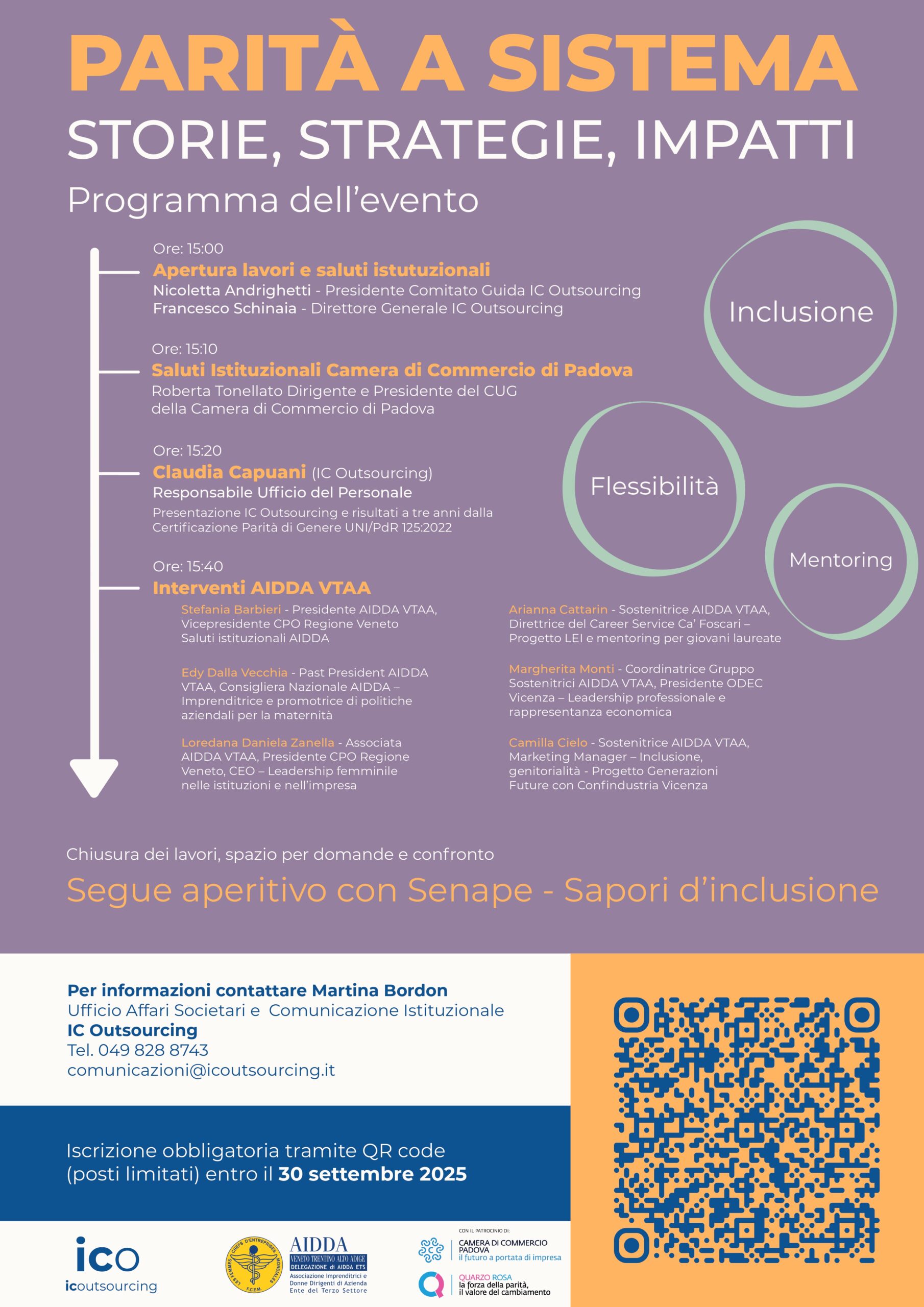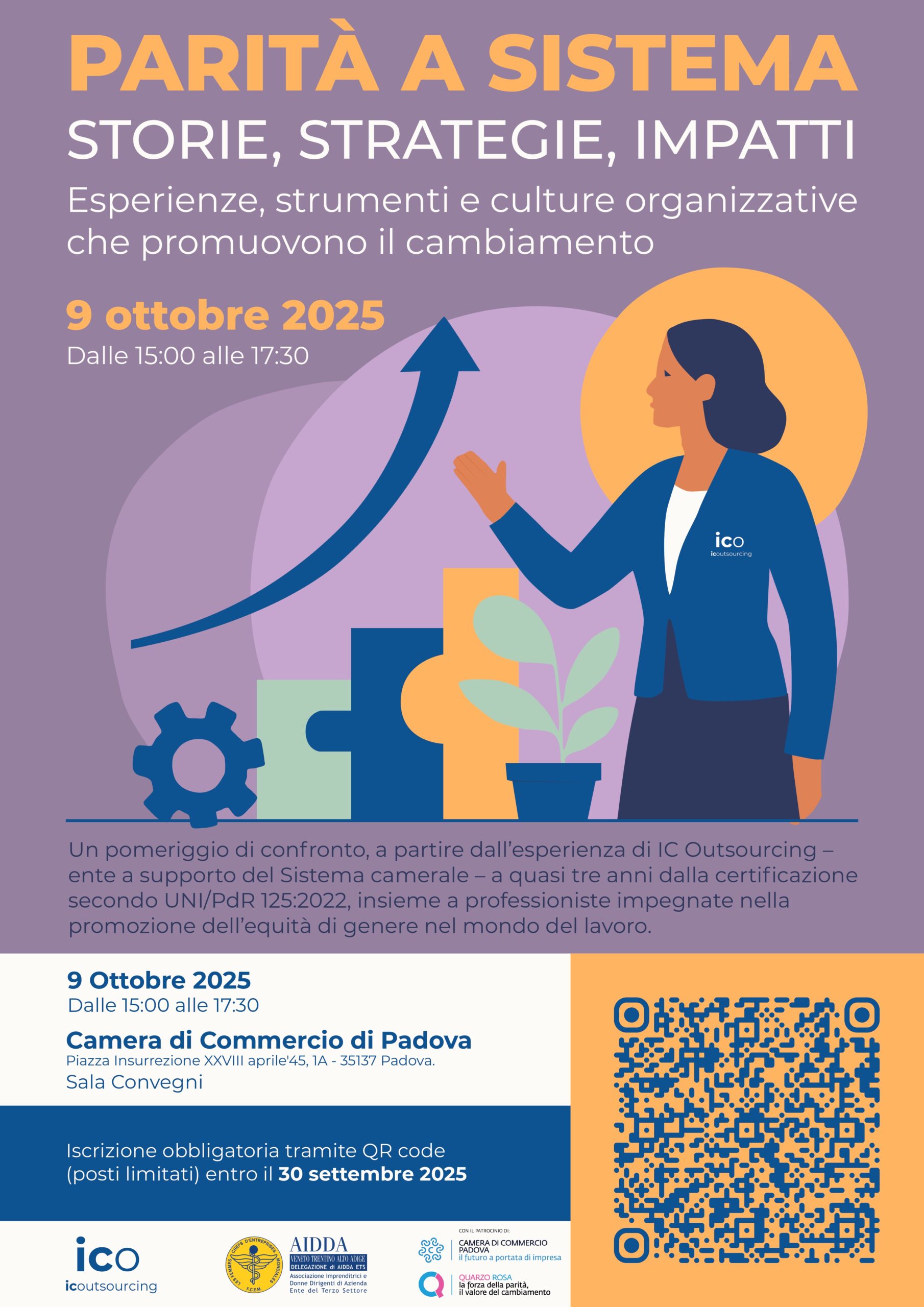Convegno “PARITA’ A SISTEMA – STORIE, STRATEGIE, IMPATTI. Esperienze, strumenti e culture organizzative che promuovono il cambiamento”, organizzato da IC Outsourcing in collaborazione con la nostra Delegazione AIDDA VTAA e con il patrocinio della Camera di Commercio di Padova, che si terrà giovedì 9 ottobre 2025 dalle ore 15:00 alle ore 17:30 presso la Sala Convegni della Camera di Commercio di Padova (Piazza Insurrezione XXVIII Aprile 1945, 1/A – Padova)