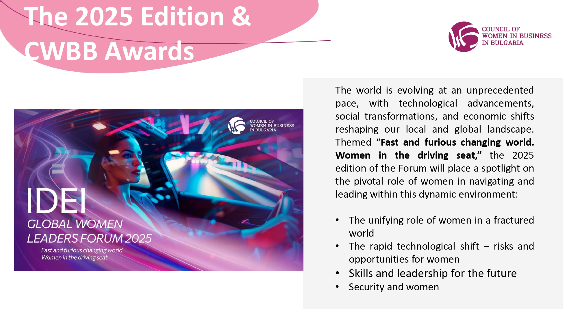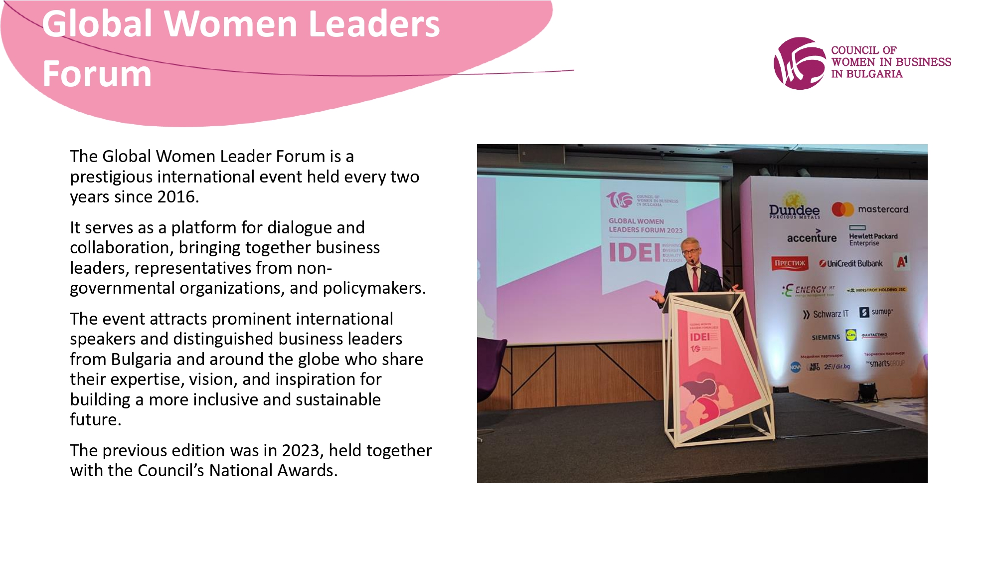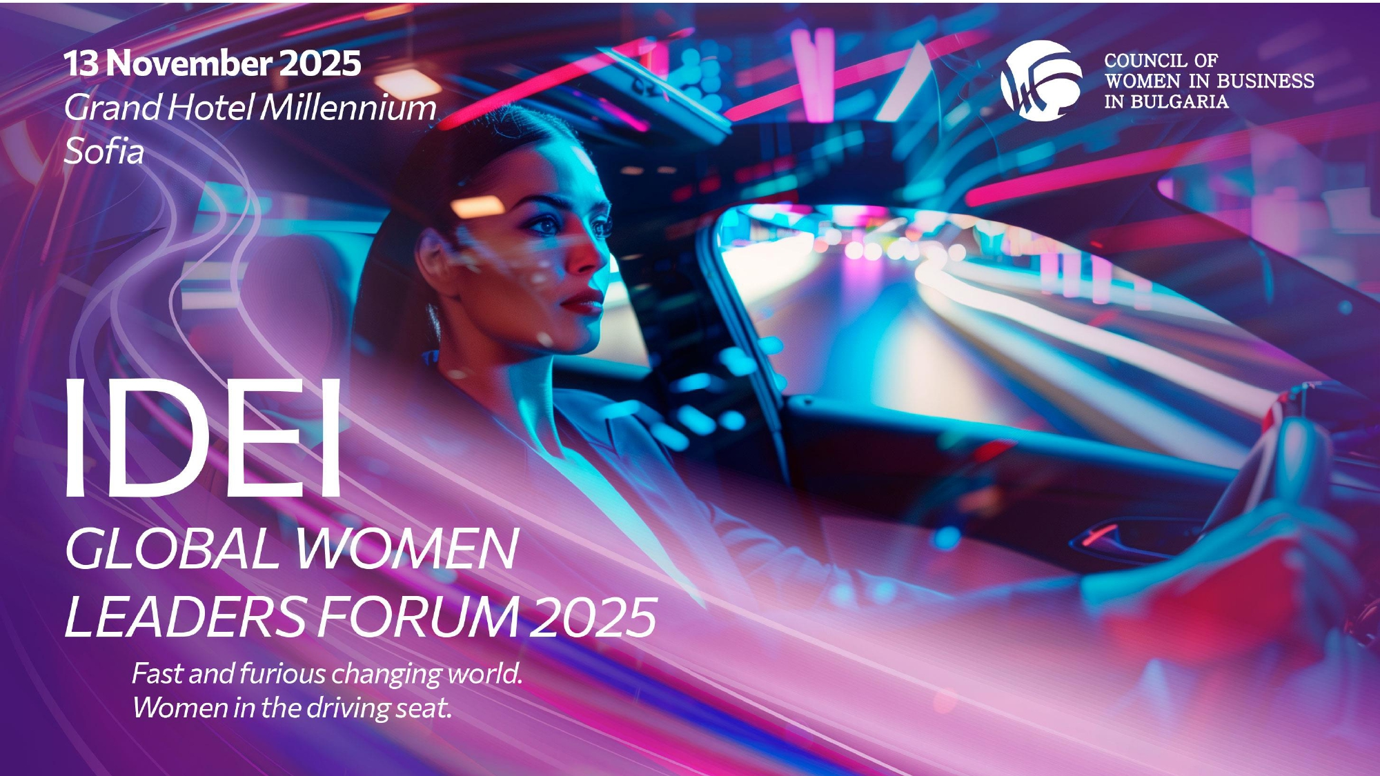 A nome del Council of Women in Business in Bulgaria (CWBB), sono lieta di invitarvi a partecipare al Global Women Leaders Forum 2025, che si terrà il 13 novembre 2025 presso il Grand Hotel Millennium di Sofia.