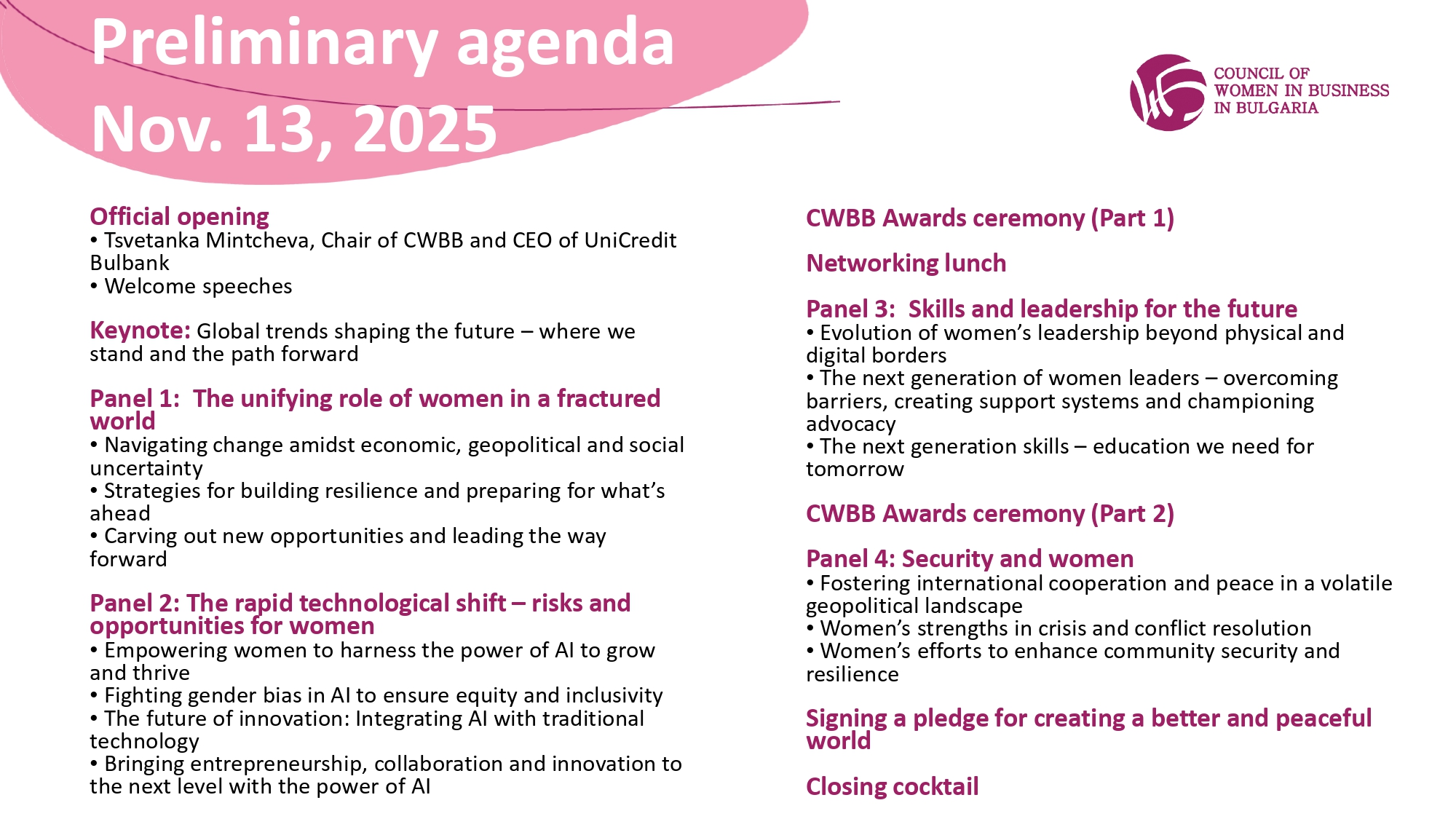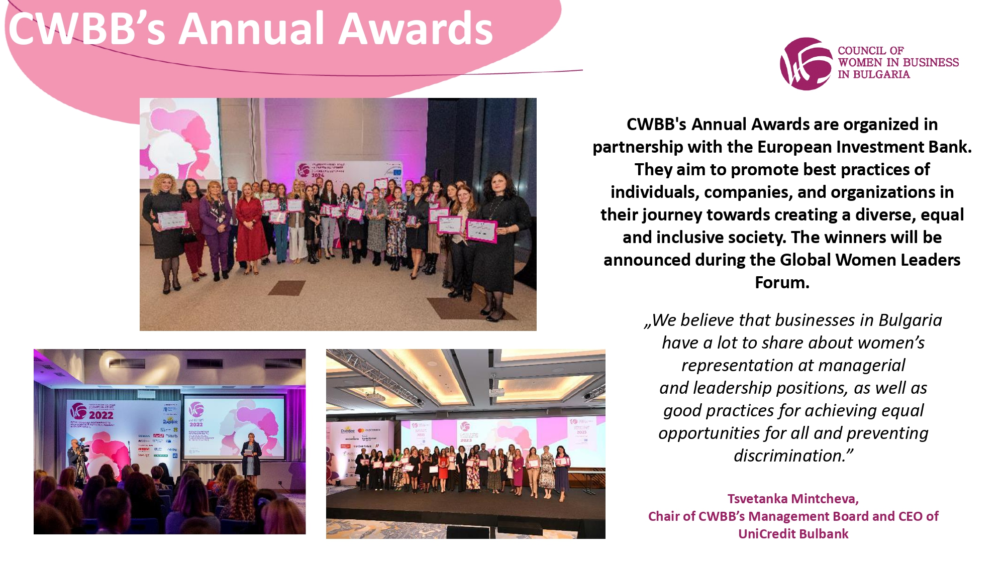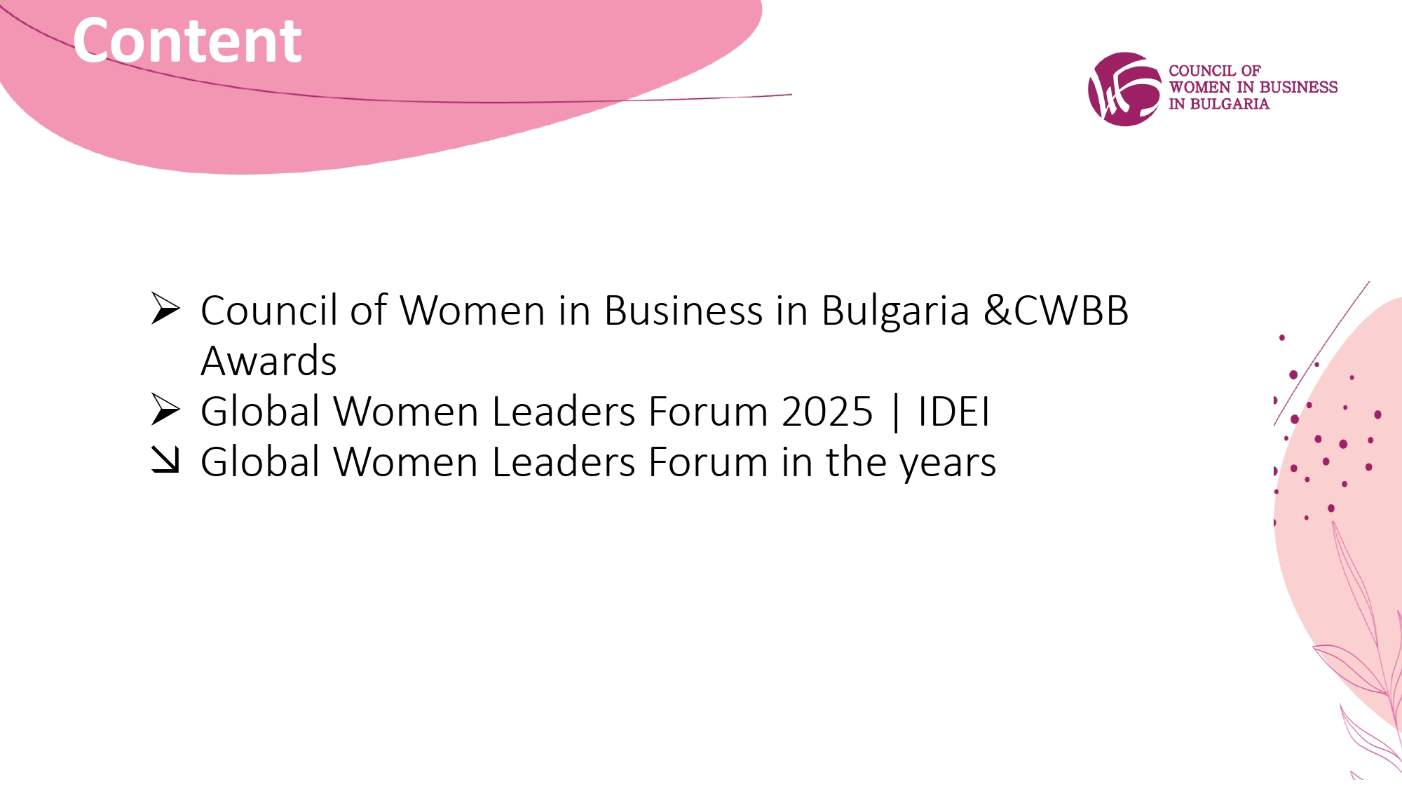 A nome del Council of Women in Business in Bulgaria (CWBB), sono lieta di invitarvi a partecipare al Global Women Leaders Forum 2025, che si terrà il 13 novembre 2025 presso il Grand Hotel Millennium di Sofia.