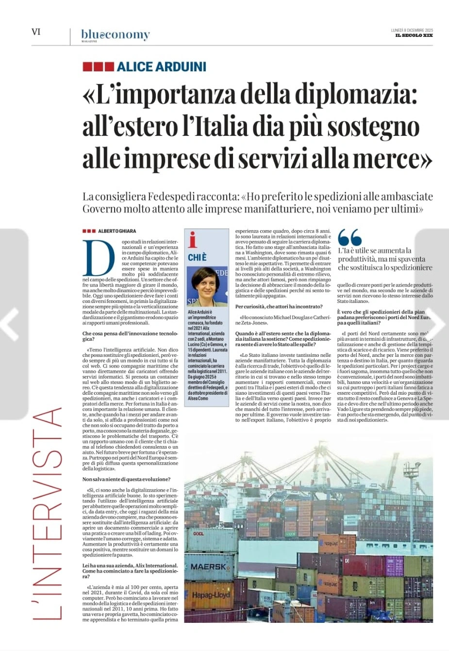 Congratulazioni ad Alice Arduini per la lunga intervista che le ha dedicato il quotidiano genovese, Il Secolo XIX. Alice ha raccontato la sua esperienza lavorativa, nata in ambito diplomatico e poi proseguita nel settore logistico. Fino alla creazione della sua azienda la Alix International, che impiega 15 dipendenti su due sedi a Como e Genova. Da giugno 2025 è membro del Consiglio direttivo di Fedespedi, e da ottobre presidente di Alsea Como.