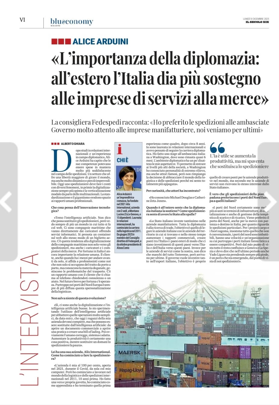 Congratulazioni ad Alice Arduini per la lunga intervista che le ha dedicato il quotidiano genovese, Il Secolo XIX. Alice ha raccontato la sua esperienza lavorativa, nata in ambito diplomatico e poi proseguita nel settore logistico. Fino alla creazione della sua azienda la Alix International, che impiega 15 dipendenti su due sedi a Como e Genova. Da giugno 2025 è membro del Consiglio direttivo di Fedespedi, e da ottobre presidente di Alsea Como.