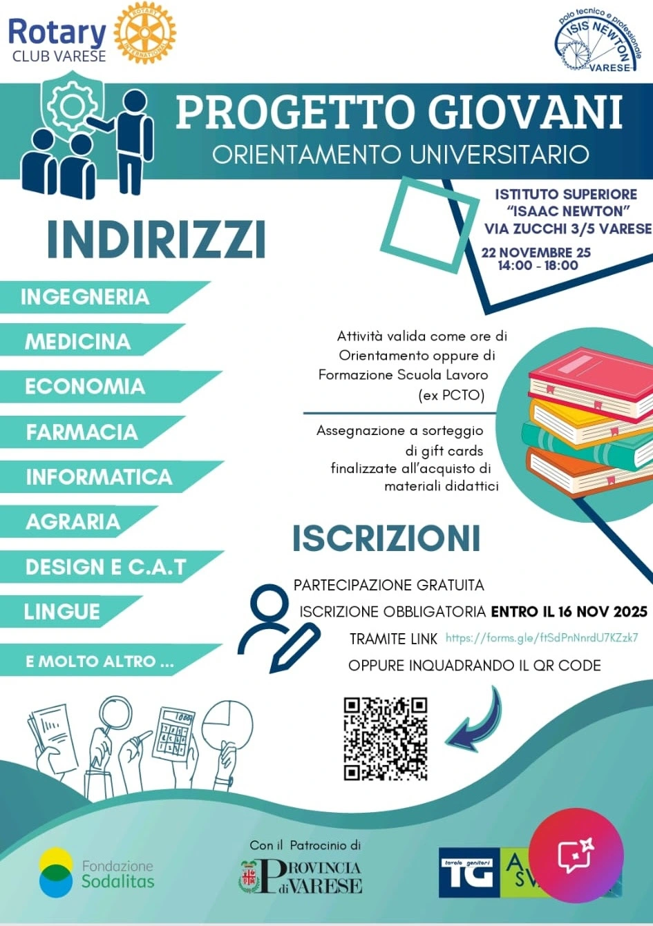 La nostra presidente Luisa Cazzaro parteciperà al pomeriggio dedicato all’Orientamento Universitario organizzato dal Rotary Club di Varese e dall’ISIS Newton che si terrà il 22 novembre alle 14:00 presso la sede dell’Istituto Superiore Isaac Newton in via Zucchi 3 a Varese.