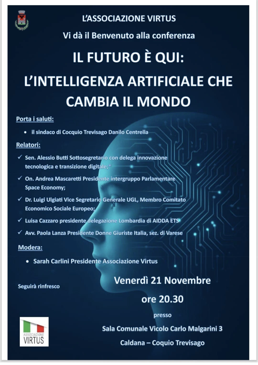 La nostra presidente Luisa Cazzaro sarà relatrice alla conferenza Il futuro è qui: l’intelligenza artificiale che cambia il mondo. Organizzata dall’Associazione Virtus. L’incontro si terrà il 21 novembre alle 20:30 presso la Sala Comunale di Caldana – Cocquio Trevisago in provincia di Varese. Interverranno, oltre a Luisa, il sen. Alessio Butti, Sottosegretario con delega all’innovazione tecnologica e transizione digitale, on. Andrea Mascaretti, Presidente intergruppo parlamentare space economy, Luigi Ulgiati, Vice Segretario Generale Vicario di Ugl , avv. Paola Lanza, Presidente Donne Giuriste Varese.