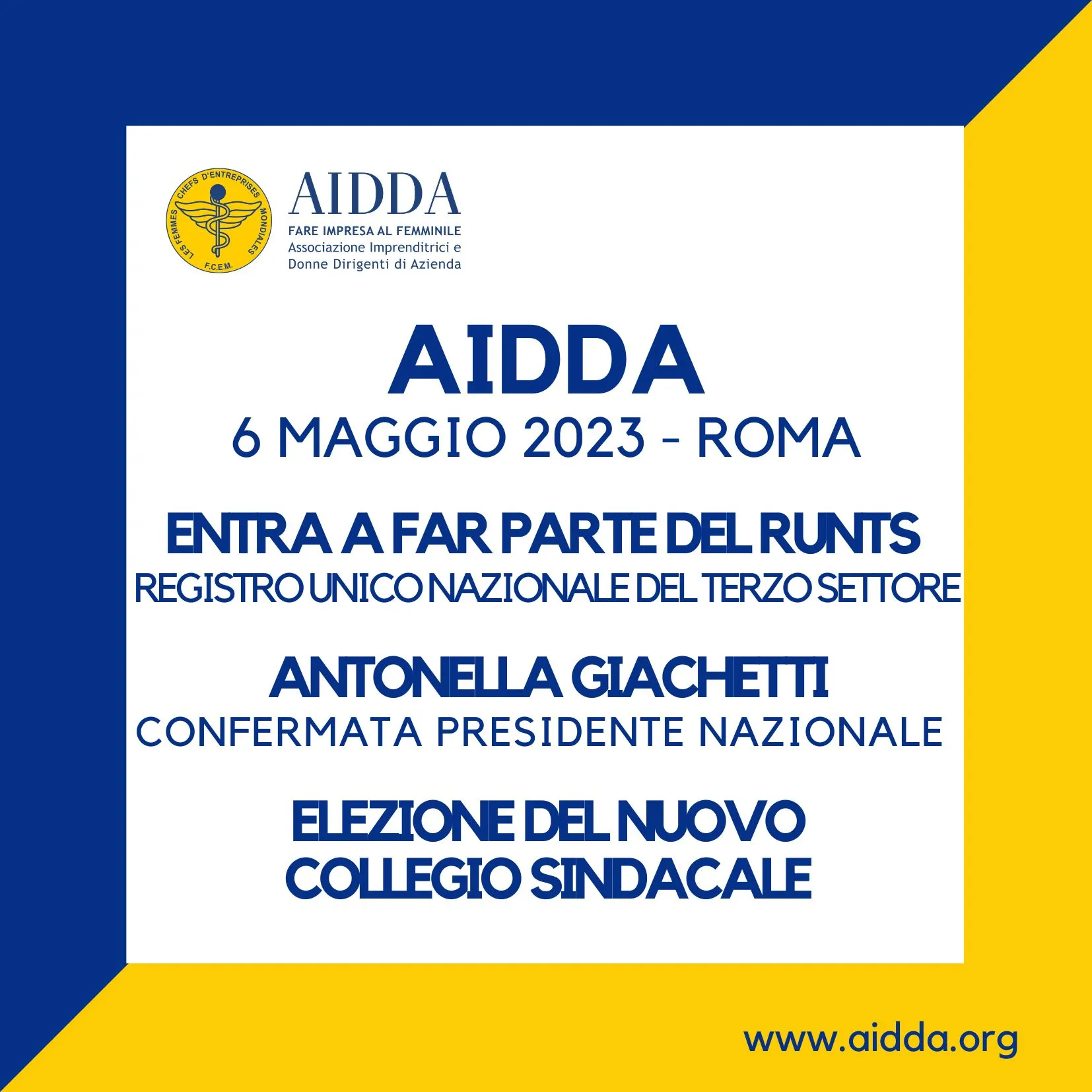AIDDA nel giorno della sua Assemblea, il 6 maggio 2023 a Roma, diventa "Ente del terzo settore(ETS)" e assume la personalità giuridica. Per acclamazione confermata presidente nazionale Antonella Giachetti ed elezione del collegio sindacate (Piera Braja, Teresa Federici e Rita Pelagotti).