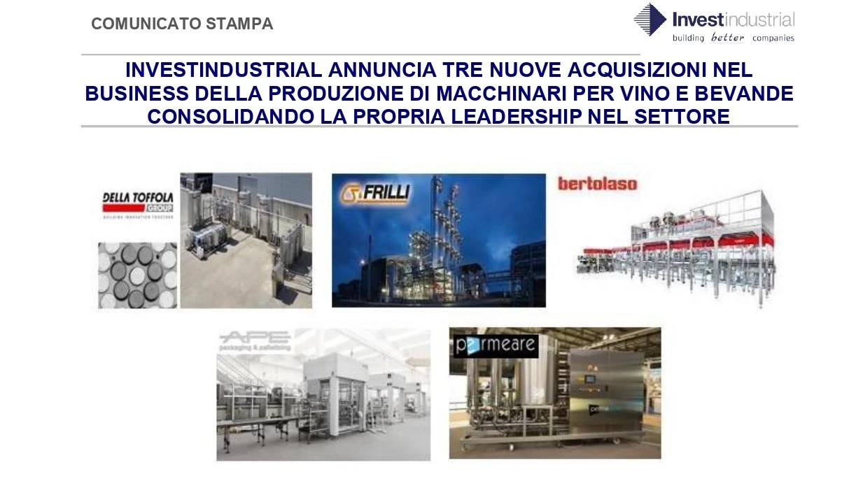 "Bertolaso Group"storico marchio leader nella progettazione e produzione di impianti di imbottigliamento automatizzato, di proprietà della Socia AIDDA Veneto TAA Cristina Bertolaso, è stata acquisita da "Investindustrial" leader mondiale nel settore della produzione e progettazione di macchinari e impianti per vino, bevande e distillazione.