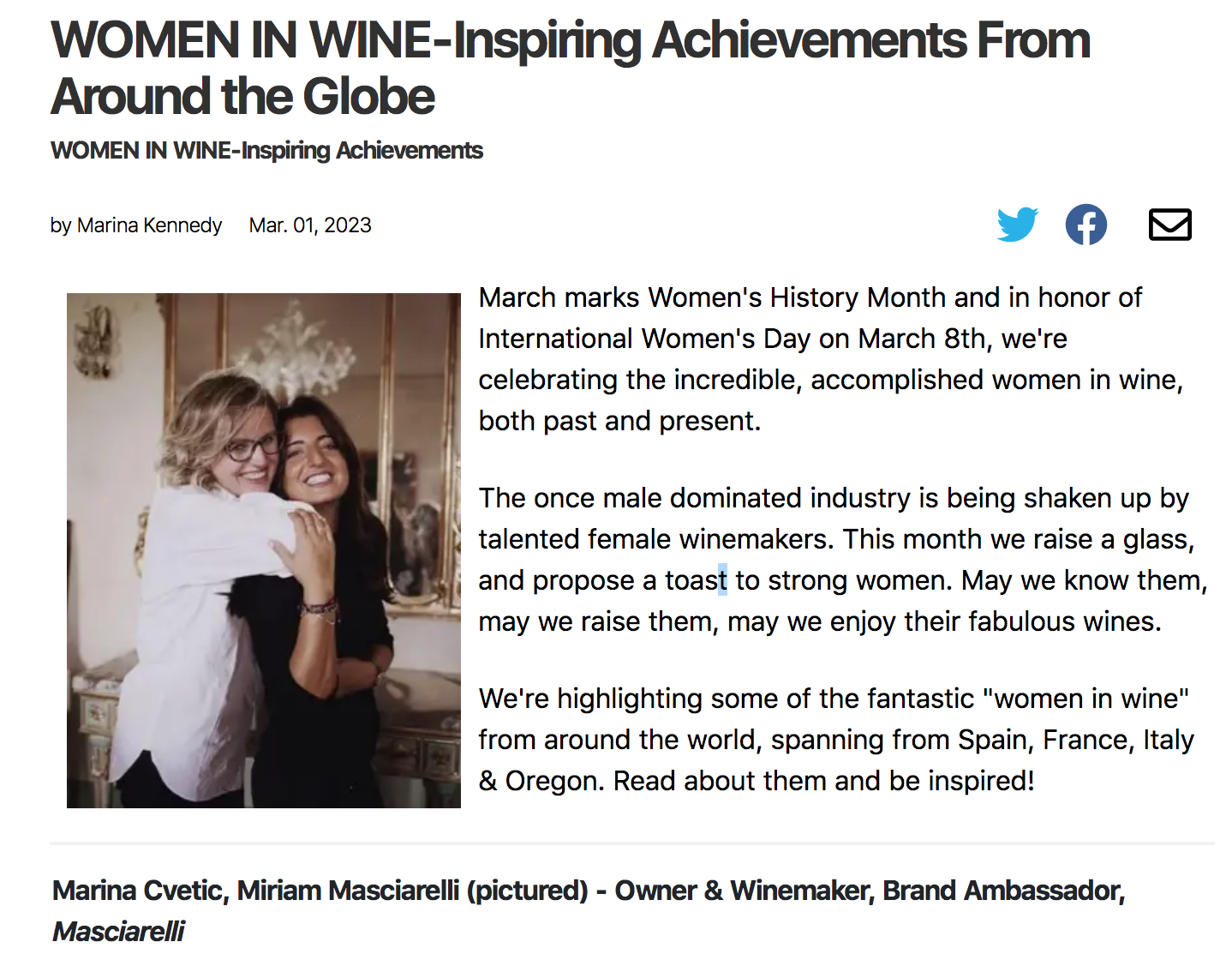 Marina Cvetic Masciarelli e la figlia Miriam, sono state citate dalla testata on line Broadway World nell’articolo Donne del vino. Risultati che ispirano da tutto il mondo. "La Cantina Masciarelli è guidata da Marina Cvetic, moglie di Gianni Masciarelli, e dalla loro primogenita Miriam Lee Masciarelli, che insieme hanno raccolto la difficile eredità di continuare ad elevare i vini e i vitigni abruzzesi nel panorama enologico mondiale.