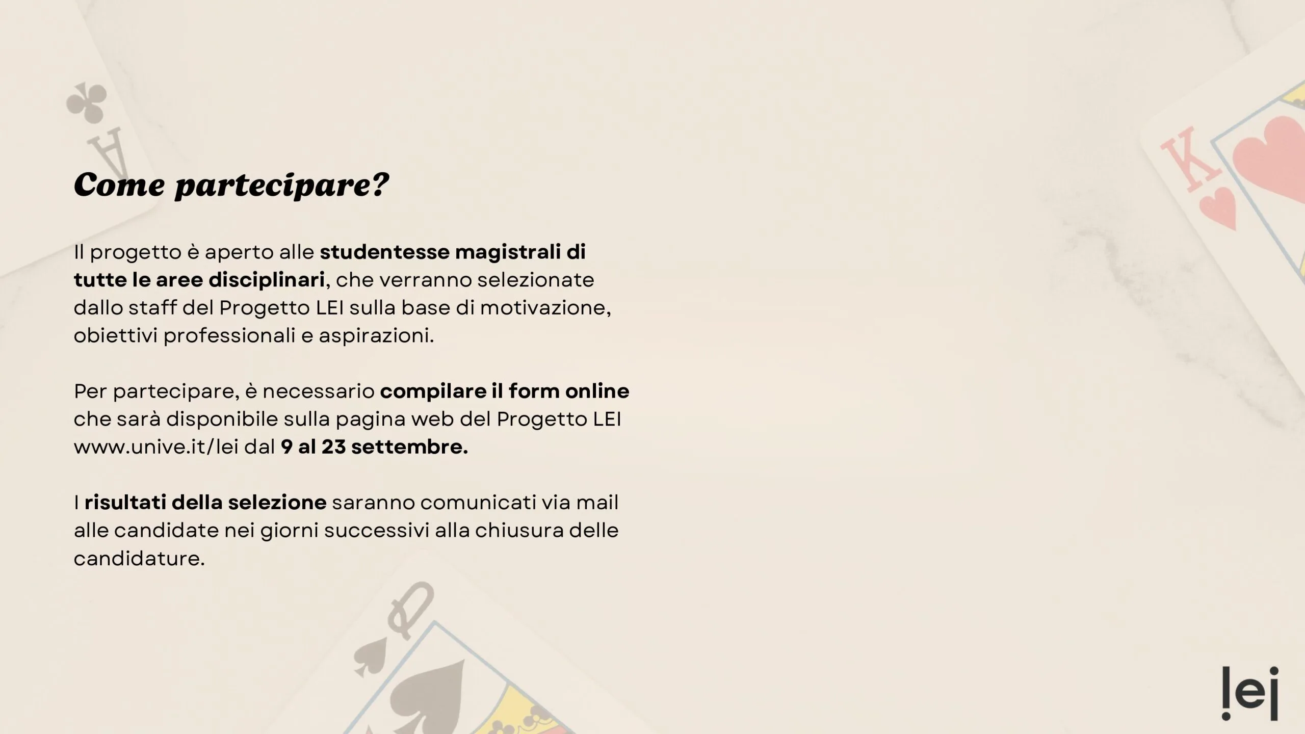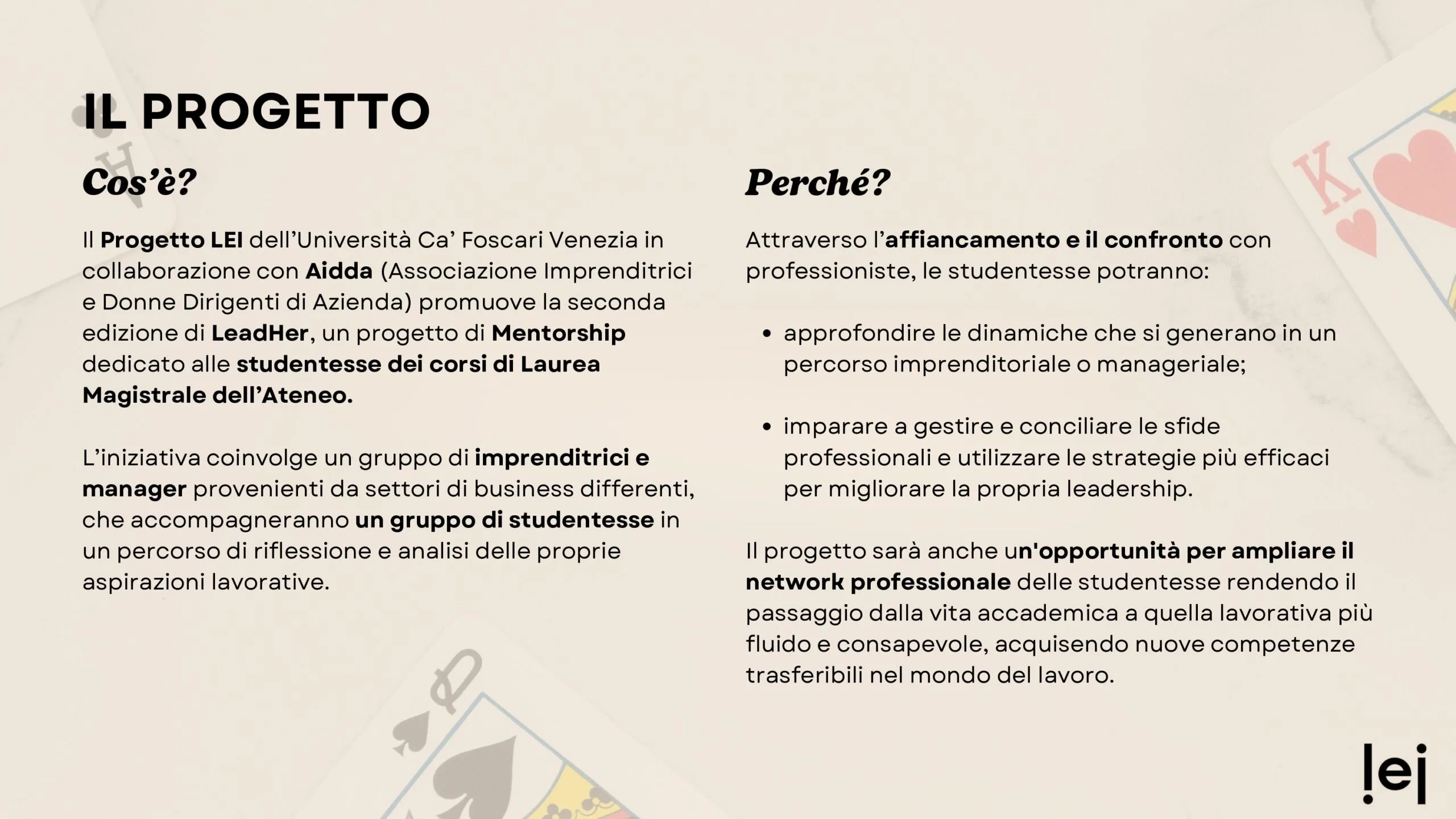 AIDDA Delegazione Veneto Trentino Alto Adige è felice di annunciare la partenza della 2° edizione di “LeadHer” il percorso di mentoring promosso dal Progetto LEI, la cui responsabile è la Sostenitrice AIDDA Delegazione Veneto Trentino Alto Adige Arianna Cattarin, che ha visto nella sua prima edizione la collaborazione di AIDDA Delegazione Veneto Trentino Alto Adige & l’Università Ca’ Foscari di Venezia.